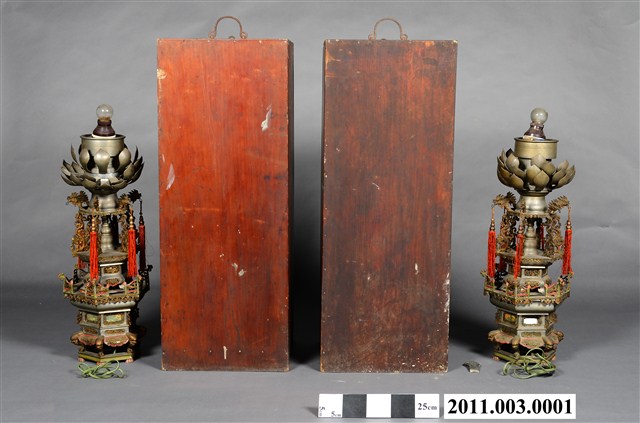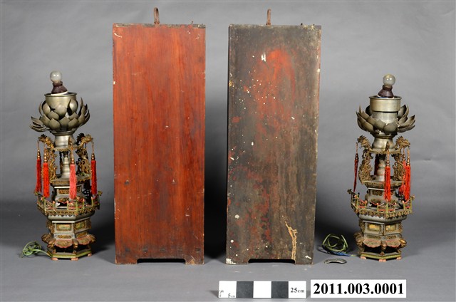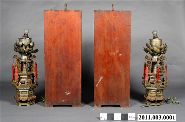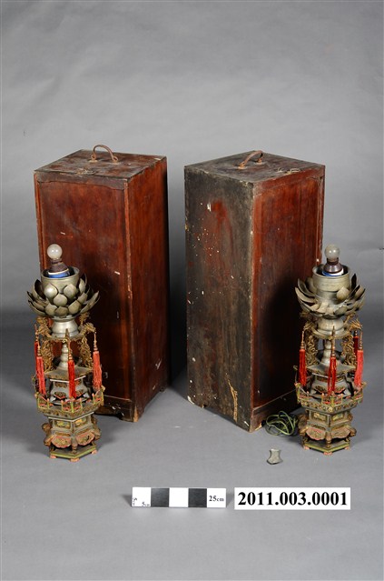 1.本件為錫製紅柑燈1對含木箱,紅柑燈的下半部臺身作六角形塔樓造型,臺身飾以吉祥紋飾,部分結構施以彩繪。中半部以6個昇龍柱作支撐,龍口銜紅色流蘇,燈臺頂端為蓮花瓣拱起電燈泡和燈罩,燈罩已遺失。燈罩造型一般為圓形的朱紅色,形似一只大柑橘,因此俗稱紅柑燈。