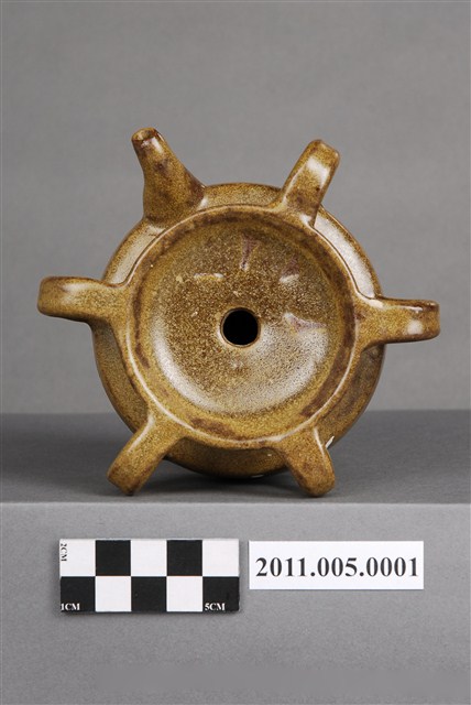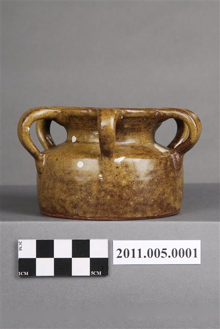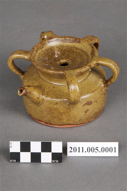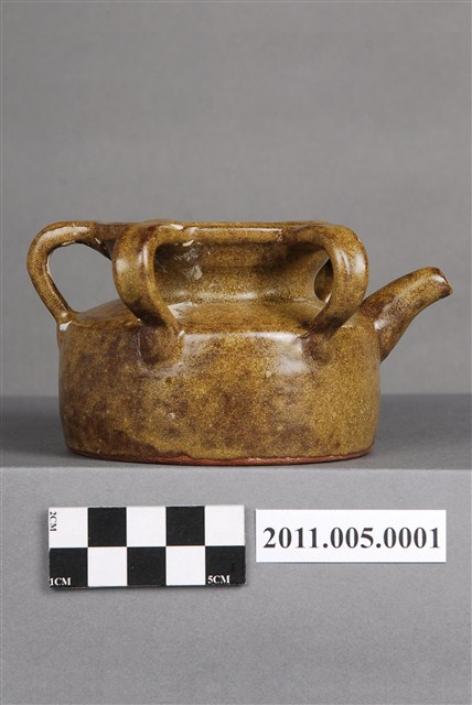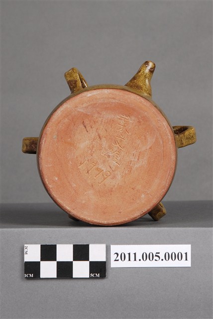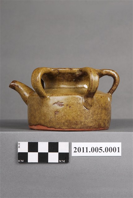 1.本件茶葉末釉四繫帶柄注壺,器形為圓唇,盤口,口沿至肩部連接四繫,注口短小,注流對稱面帶柄,頸部內收,腹部微股,平底。全器施黃綠釉,釉不及底,近底部即露胎,胎色偏紅。底部有作者「葉文雄1999」款識,為作者因懷舊之情而製作。連接口沿與肩部的四繫及短柄合觀如梅花,故此類型制容器又稱「五梅罐」或「五梅壺」。此種容器為婦女梳妝時裝盛髮油或燻油的容器,依其功能又有「燻油壺」、「茶油壺」之稱。