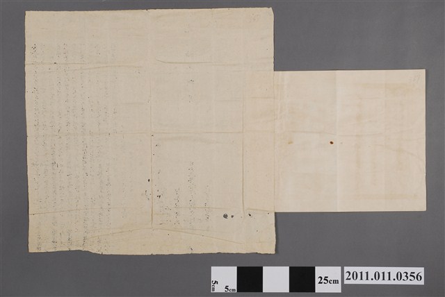 此為光緒10年(1884)8月的契頭及明治34年(1901)10月的契尾。臺邑郡(臺南府城)大東門外仁和里德高厝社劉文煌文鎚文旺等,將園典與郡大西門外試經口蘇貞源,價格六八秤銀300大員。契尾詳載這契頭之日本時代調查後之地址。如座落為臺南縣永康下里後甲庄土名大路巷月字各號,並說明典的金額及稅金為三元,有趣的是把當初的大員都等同於日圓。(契頭全文如下)仝立典契字人臺邑郡大東門外仁和里德高厝社劉文煌、鎚、旺等,有承先父遺下之業下則園貳宗,共肆坵,坐落永康下里,年納課粟共參石捌斗正,勻丁照配,其園壹坵,受種柒分,坐落大路巷一檨宅園,東至卓家園,西至墓埔,南至許家園,北至車路。又園貳坵比連,受種玖分,坐落後甲社前,土名新墓,東至蘇家園又至車路,西至墓埔又至陳家園,南至陳家園,北至車路。又園壹坵,坐落後甲社前,受種伍分,東至□仔車路,西、南俱至林家園,北至大路,四至明白為界。今因先父在日生理不就,積欠借項,乏銀還項,愿將此園肆坵出典抵還借項。先盡問房親叔兄弟侄人等,不能承受,外托中引就向與郡大西門外試經口蘇貞源頭承典,三面言議,時價六八足秤銀參佰大元。其銀即日仝中交訖,其園隨即踏明界址,交付銀主前去掌管,招佃耕作,收成納稅。限至叁年終為滿,聽典主偹足契面銀贖回原契,銀主不得刁難。如至期無銀可贖,仍聽銀主再掌管,不敢阻當生端異言滋事。保此園果係是鎚等承先父之業,與別房親人等無干,亦無重張典借他人財物為碍,以及交加來歷不明等情。如有不明等情,鎚等自出頭抵當,不干銀主之事。此係二比甘愿,各無反悔,口恐無憑,今欲有憑,合立典契字壹紙,并帶連上手契陸紙,合共柒紙,付執存炤。 即日仝中收過來六八足秤銀參佰大員完足,再炤。 內添承字壹字,又炤。 為中人劉朝選、吳廷均 知見人母鄭氏 光緒拾年捌月日仝立典契字人劉文煌、劉文鎚、劉文旺 代書人劉萬青(契尾全文如下)契尾參○ 契尾番號:參○。 契約年月日:光緒十年八月。 種目:質入。 質入人住所氏名:台南縣仁和里竹篙厝庄劉文煌、鎚、旺。 質取人住所氏名:台南市第五區試經口三十三番戶,蘇貞源ノ事蘇蘊白。 事項: 位置:坐落台南縣永康下里後甲庄土名大路巷月字第二七六、三二八、三二九、二七三號。 目的物:中則園四坵,計壹甲九分九厘九毫參絲,小租權。 金額:參百圓,地租金六圓參拾九錢八厘。 稅金:參圓 明治三十年律令第四號契稅規則ニ由リ此契尾ヲ授與ス。 明治三十四年十月廿九日臺南縣(戳記:臺南縣印) 譯文 右遵照明治三十年律令第四號契稅章程,授執契尾為照。註:永康下里後甲庄大路巷,位於今臺南市東區關聖里。