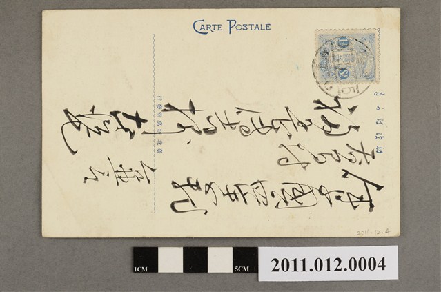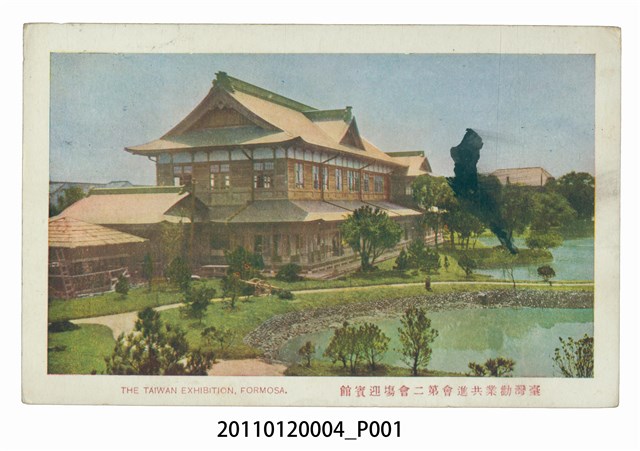 1. 本物件為以臺灣勸業共進會為主題的明信片。正面為臺灣勸業共進會迎賓館的彩色圖片,迎賓館為一和式二層樓建築,旁有小湖。下方印「臺灣勸業共進會第二會場迎賓館」、「THE TAIWAN EXHIBITION, FORMOSA.」。右方有一塊墨漬。背面為書寫面,右上角為郵票黏貼處,貼有一枚面額一錢五厘的郵票,並蓋有郵戳。右側為「郵便はかき」。上方為「CARTE POSTALE」,中間偏左有一波浪形分隔線,分隔線右方有「臺北新高堂發行」字樣。有前人書寫之文字。2. 大正5年(1916),日人統計臺灣20周年,臺灣總督府於臺北舉辦「臺灣勸業共進會」大型展覽會及慶祝活動。第二會場設置於總督府殖產局林業試驗場,迎賓館建築為當時總督府殖產局商品陳列館。