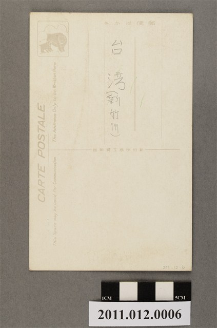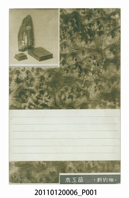 1. 本物件為以新竹州為主題的明信片。正面為新竹州木工品的黑白照片,左上方為木工品,上有一椰子樹與正在杵米的原住民。底圖似為木紋。下方有數條橫線構成之白色區塊。右下方有「木工品 .新竹州.」字樣。背面為書寫處,右上角為郵票黏貼處,內有母子熊圖樣。右側印「郵便はかき」,上方為上方印「CRATE POSTALE」、「This Space may used for Communication」、「The Address Only to be written Here」。中間為一T字形分隔線,印有「新竹州商工獎勵館」。分隔線右方有書寫線,上有「台湾(新竹州)」字跡。2. 新竹州為日治時期的行政區劃,轄域為今桃園市、新竹市、新竹縣、苗栗縣。