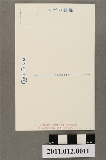 2.正面影像滿版印刷,無文字。背面則印有藍色文字「郵便ハガキ、CARTE POSTALE、生蕃屋商店發行」,以及紅色說明文字「(台灣阿里山)千年ノ老樹續ク一斧ニ斷タレントス、145. CUTTING A LARGE TREE, MT. ARI FORMOSA.」。