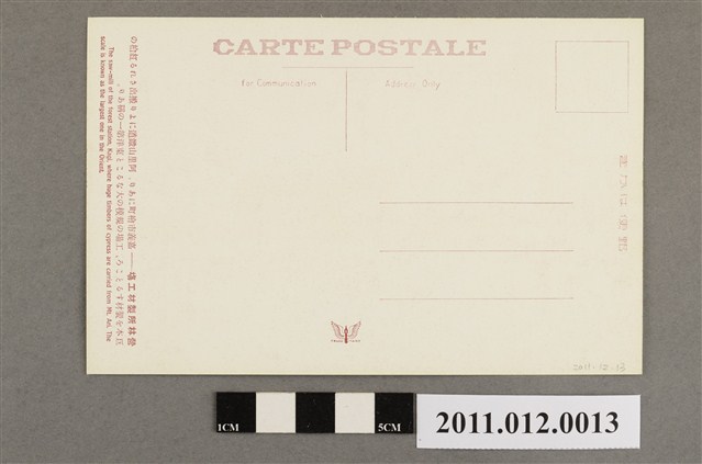 1. 本物件為以營林所製材工場為主題的明信片。正面為營林所製材工場的彩色圖片,中央為一貯木池,池邊放置數堆木材。右方有一木塔,中間有一正在冒煙的煙囪,左方有一紅色磚房。背面為書寫面,右上角為郵票黏貼處,右側印「郵便はかき」,上方印「CRATE POSTALE」、「for Communication」、「Address only」。下方有一展翅鳥形商標。左側印有「營林所製材工場……嘉義市檜町にあり、阿里山鐵道により搬出される紅檜の巨木を製材するところ、工場の規模の大なること東洋第一の稱あり。」(位於嘉義市檜町,將經由阿里山鐵路運出的紅檜巨木製成木材,工場規模之大可稱為東洋第一)、「The saw-mill of the forest station, Kagi, where huge timbers of cypress are carried from Mt. Ari. The scale is known as the largest one in the Orient.」