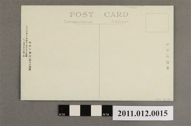 2.正面影像滿版印刷,無文字。背面則印有灰色文字「郵便はかき、POST CARD、Correspondence、Address」,以及說明文字「(臺灣日月潭)化蕃の住家、蕃屋も今では全く本島化して居るのには亦一驚せざるを得ない。」(譯:現在原住民的住家也全部本島化(漢化),也不得不一驚。) 。