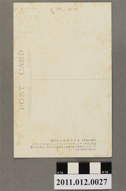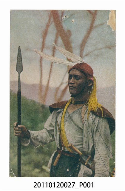 1. 本物件為以原住民鄒族為主題的明信片。正面為鄒族出草時穿著的彩色圖片,帽子有羽毛與黃穗裝飾,腰繫番刀,手持長矛。背面為書寫面,右上角為郵票黏貼處,右側印「郵便はかき」,上方為「POST CARD」、「Correspondence」、「Address」,中間為一T形分隔線。左側印「(蕃地の景觀)出草の風貌(ツオウ族)蕃族にはタイヤル、サイセツト、ブタン、ツオウ、バイワン、アミヤミの七種族で其の風俗も多少違つてゐる、此はツオウ族の出草の風貌である」(蕃族有泰雅族、賽夏族、布農族、鄒族、排灣族、阿美族及雅美族等七個種族,每個種族都有自己獨特的風俗,這是鄒族出草的風貌)。2. 鄒族分佈區域以嘉義縣阿里山鄉為主,亦有部份居住於南投縣信義鄉。社會組織以嚴格的父系氏族組織及大、小社分脈聯合之政治組織為主。部落事務及祭儀皆以男子會所「庫巴」為中心,未婚之青少年均居住於此接受訓練,女性則禁止進入。