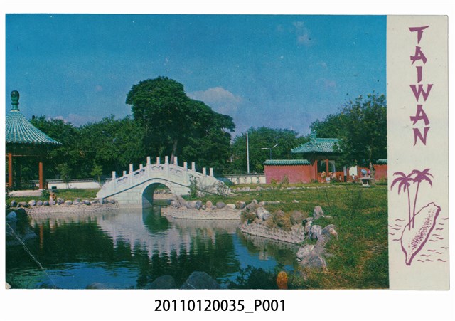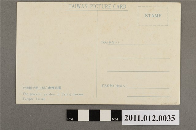 1. 本物件為以延平郡王祠為主題的明信片。正面為延平郡王祠內庭園的彩色圖片,左方有一涼亭,中央有一拱橋與池塘,右方可見山門。右方有一白色區域,以紫色字直書「TAIWAN」,及一臺灣圖案,上有椰子樹,左右有波浪紋。背面為書寫面,右上角為郵票黏貼處,內印「STAMP」,上方為「TAIWAN PICTURE CARD」,下為一T字形分隔線,右側為「TO:(收信人)、「FROM:(發信人)」,左下方印「台南延平郡王祠之幽雅庭園」、「The graceful garden of Eypinjiunwang Temple. Tainan.」。2. 神社於臺灣的興建,與殖民政府想透徹的進行皇民化運動有關。臺灣地區神社暴增於西元1936至1940年間,即是配合皇民化運動之進行。開山神社位於今臺南市中西區,清領時期為開臺聖王廟;1875年沈葆楨奏請朝廷改稱其為延平郡王廟(又稱延平郡王祠),主奉鄭成功;1897年日本殖民政府欲利用鄭成功之母為日本人田川氏此點,供奉鄭成功及其母親,以彰顯日本於臺灣統治的正當性,故將此改為開山神社,列為縣社。目前中央正殿設有鄭成功塑像與神位,左為甘輝將軍、右為張禮將軍,後殿祭祀其生母田川氏,左殿為監王祠祀有鄭克塽,右殿則為寧靖祠,祀有寧靖王及其五妃。
