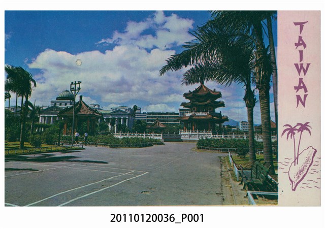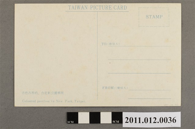1. 本物件為以臺北新公園為主題的明信片。正面為臺北新公園的彩色圖片,左、右各有一中式涼庭樓閣。左後方圓形屋頂為臺灣省立博物館(今國立臺灣博物館)。右方有一白色區域,以紫色字直書「TAIWAN」,及一臺灣圖案,上有椰子樹,左右有波浪紋。背面為書寫面,右上角為郵票黏貼處,內印「STAMP」,上方為「TAIWAN PICTURE CARD」,下為一T字形分隔線,右側為「TO:(收信人)、「FROM:(發信人)」,左下方印「古色古香的,台北新公園華閣」、「Coloured pavilion in New Park. Taipei.」。2. 臺北新公園於西元1908年落成,又有「新公園」、「臺北公園」之稱,為市區計畫之中實現的產物,並於公園內建立「兒玉後藤紀念館」(即臺灣總督府博物館),並於1935年底舉辦的臺灣博覽會中成為主要會場,現更名為二二八和平紀念公園。