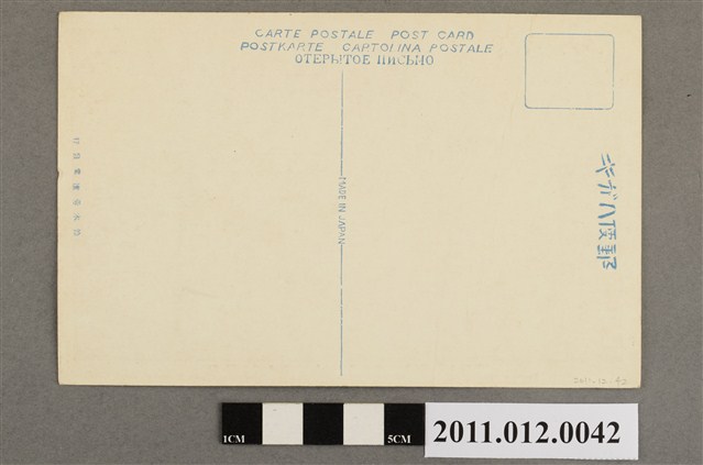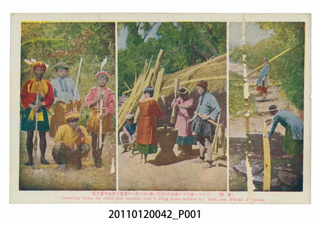 1. 本物件為以原住民排灣族為主題的明信片。正面為三張彩色圖片組成,左為四名獵人合照,皆手持獵槍。中為兩名女子以杵搗臼,左方有一蹲姿男子,右方有一腰繫番刀的立姿男子。右為兩名女子正在使用竹筒汲水。下方印「(臺灣)バイワン族母子の水汲み(竹筒の桶)婦女庭の粟搗き器蕃の蕃丁輩」、婦女、「Drawing water by child and mother, and halling some millets by bori, nes, Pawan, Formosa」。背面為書寫面,右上角為郵票黏貼處,右側印「郵便ハガキ」,上方印「CAPTE POSTALE POST CARD」、「POSTKARTE CARTOLINA POSTALE」、「OTKPbITOE ПИСbMO」,中間有一分隔線,中印「MADE IN JAPAN」,左側印「鈴木勇進堂發行」。2. 排灣族分布區北起大武山、南達恆春、西到枋寮、東到台東太麻里的中央山脈兩側。傳統的貴族頭目為各部落的政治、軍事、甚至軍事領袖,自成一獨立自治單位。以百步蛇紋及人頭紋象徵貴族的崇高地位。