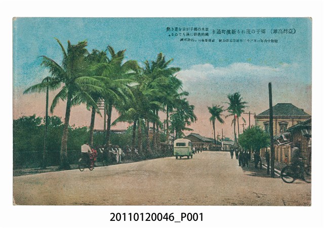 1. 本物件為以高雄為主題的明信片。正面為高雄新濱町的彩色圖片,道路左側植有一排椰子樹,馬路上有汽車與行人。右上方印「(臺灣高雄)椰子の茂れる新濱町通り」(行道樹的椰子樹因為滿是熱帶國度的色彩而惹人注目)、「並木の椰子が目を惹き熱國の色彩に滿ちてゐる。」、「昭和十六年一月二十二日地帶寫第五號 高雄要塞司令部許可濟」。背面為書寫處,右上角為郵票黏貼處,右側印「郵便はがき」,上方印「POST CARD」、「Correspondence」、「Address」,下有一T字形分隔線。2. 新濱町位於今高雄市鼓山區,因是由疏𠗕高雄港所產生的泥沙填築而成的海埔新生地而得名。