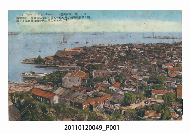 1. 本物件為以高雄旗後為主題的明信片。正面為高雄旗後聚落的彩色圖片,民宅林立。左、後方為港口,有許多船隻行駛。左上方印「72 View of Kigo, Takao. (臺灣高雄)旗後」、「高雄市の一部旗後は主に本島人の住む處、通路屈折多く錯雜せる本島風市街の代表的なるものです」(高雄市的旗後居住的主要是本島人,巷道曲折雜亂,是本島風格市街的代表)。背面為書寫處,右上角為郵票黏貼處,右側印「郵便はかき」,上方印「POST CARD」,中有一分隔線,中有「(臺北生蕃屋本店發行)」字樣。2. 旗後,或寫作旗后、旂后等,是臺灣早期市街之一,今日高雄市旗津區的一部分,位在該區北端。