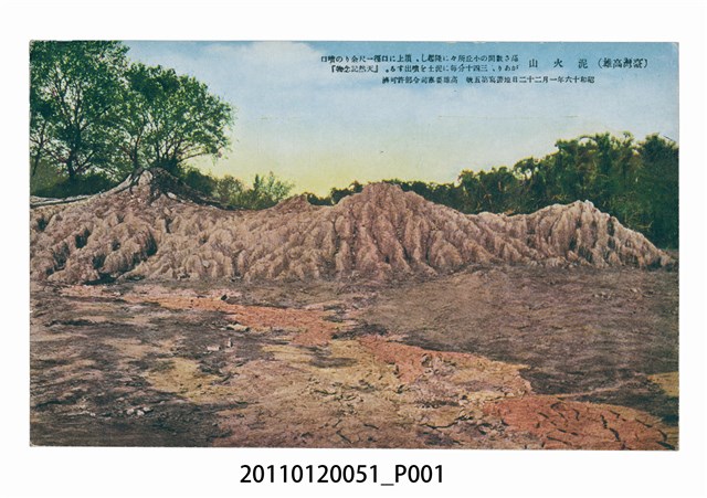 1. 本物件為以高雄泥火山為主題的明信片。正面為泥火山的彩色圖片,三個小丘與地面乾燥斑駁。右上方印「(臺灣高雄)泥火山」、「高さ數間の小丘所々に隆起、頂上に口徑一尺余りの噴口があり、三四十分每に泥土を噴出する。「天然記念物」」(高約數間的小丘上到處有隆起,其頂上有直徑約一尺多的噴口,每經過三、四十分鐘就會有泥土噴出,是「天然紀念物」)、「昭和十六年一月二十二日地帶寫第五號 高雄要塞司令部許可濟」。背面為書寫處,右上角為郵票黏貼處,內有飛馬圖案與「Tokyo Japan」字樣。右側印「郵便はがき」,上方為「POST CARD」、「Correspondence」、「Address」,中有一T字形分隔線。2. 臺灣南部泥火山主要分佈於高雄燕巢區,為分佈最密集、噴泥錐最發達之處。滾水坪位於燕巢區與橋頭區交界處,日治時期曾為天然風景保護區,因人為破壞目前僅存原面積的四分之一左右。
