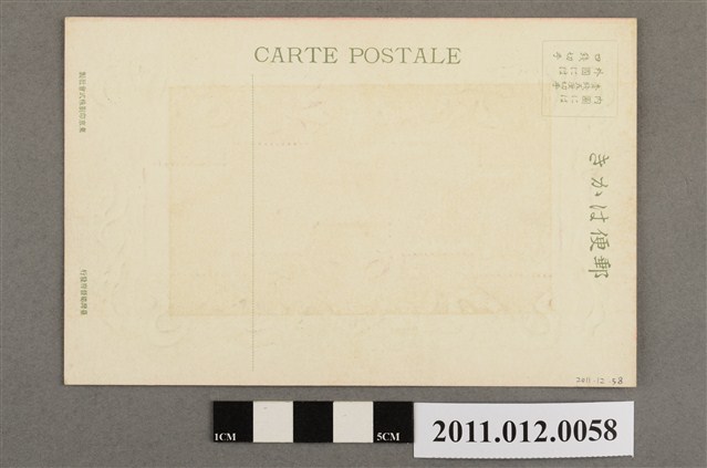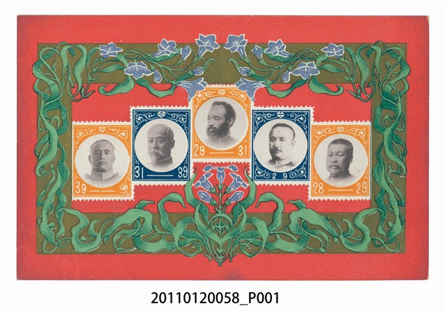 1. 本物件為以日治時期臺灣總督為主題的明信片。正面為日治時期臺灣五任總督的頭像,頭像以長方形鳶尾花圈包圍,明信片底色為紅色。由右至左為樺山資紀、桂太郎、乃木希典、兒玉源太郎、佐久間左馬太。背面為書寫處,右上角為郵票黏貼處,內有「內國には壹錢五厘切手、外國には四錢切手」,右側印「郵便はかき」,上方印「CARTE POSTALE」,中間偏左有一虛線分隔線。左側印「臺灣總督府發行」、「東京印刷株式會社製」。2. 臺灣總督為日治時期,由日本天皇指派的總督,在臺灣為擁有行政權、軍事力量與立法權的絕對權力者。日治時期共有19位臺灣總督。