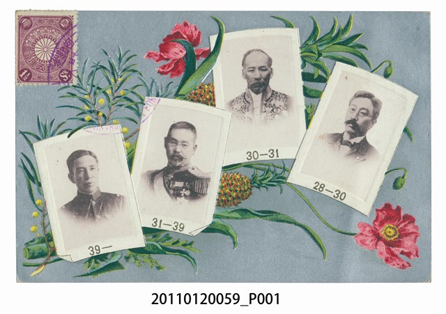 1. 本物件為以日治時期臺灣民政長官為主題的明信片。正面為日治時期臺灣四位民政長官的頭像,頭像下方為手繪之鳳梨、茶花等圖像。左上角貼有一枚壹錢五厘的郵票,並蓋有戳記,僅能辨識出「二回紀念」。頭像由右至左為水野遵、曾根靜夫、後藤新平、祀辰巳。背面為書寫處,右上角為郵票黏貼處,內有「內國には壹錢五厘切手、外國には四錢切手」,右側印「郵便はかき」,上方印「CARTE POSTALE」,中間偏左有一虛線分隔線。左側印「臺灣總督府發行」、「東京印刷株式會社製」。2. 水野遵(1850-1900)於明治28年至30年(1895-1897)擔任臺灣首任民政長官。曾根靜夫於明治30至31年(1897-1898)擔任臺灣民政長官。後藤新平(1857-1929)於明治31至39年(1898-1906)擔任臺灣民政長官。祝辰巳(1867-1908)於明治39年(1906)擔任第四任民政長官,明治41年(1908)殉職。3. 民政長官為日治時期各項政策的實際執行官僚,原為臺灣總督府民政局的首長,民政部廢除後,該職位被保留並更名為總務長官,其中以後藤新平最為著名,在其任內實施土地調查、人口普查、漸禁鴉片、鐵路修築、港口建設、確立專賣制度等。