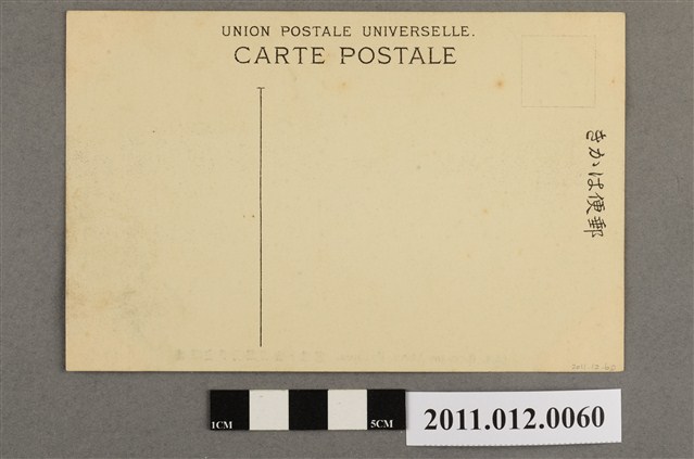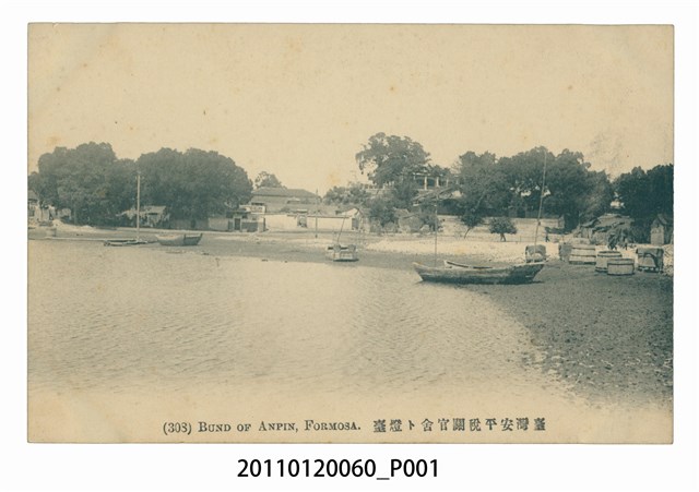 1. 本物件為以安平稅關為主題的明信片。正面為安平稅關的黑白照,前方為臺南運河,岸邊停靠數艘船,後方為安平稅關官舍(左)與燈臺(右方兩樹之間)。下方印「臺灣安平稅關官舍ト燈臺」、「(303)BUND OF ANPIN, FORMOSA.」。背面為書寫面,右上角為郵票黏貼處,右側印有「郵便はがき」,中間偏右方印有「UNION POSTALE UNIVERSELLE.」、「CARTE POSTALE」。中間偏左有一分隔線。2. 大正15年(1916)臺南新運河開通。昭和5年(1930)安平海關移至新運海安平船塢,原海關建物設置安平水產學校。