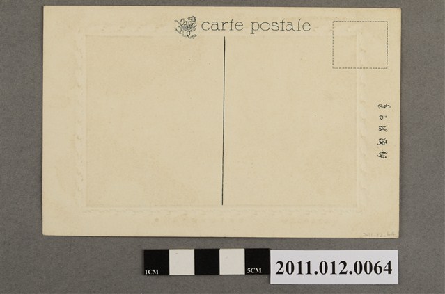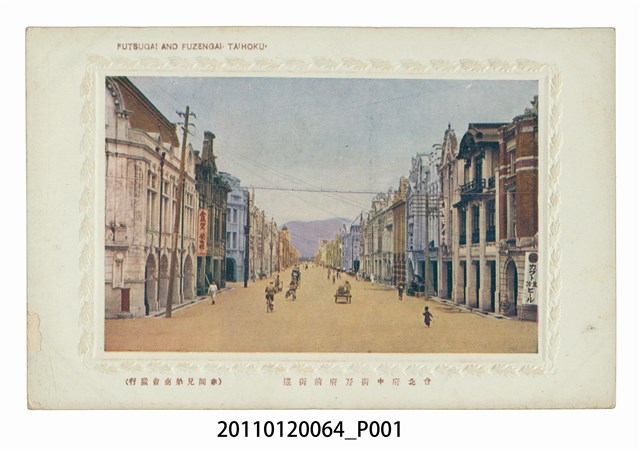 1. 本物件為以臺北為主題的明信片。正面為臺北府中街與府前街的彩色圖片,馬路兩旁均為磚造二層建物,馬路上行人如織。圖片四周以凸印壓花圍繞,下方印「台北府中街及府前街通」、「(赤岡兄弟商會發行)」。背面為書寫處,右上角為郵票黏貼處,右側印「郵便はかき」,上方為一飛馬圖樣與「CARTE POSTALE」,中間為一分隔線。2. 圖片為由重慶南路衡陽路口往北拍攝;以重慶南路為界,以東為府中街、以西為府前街。