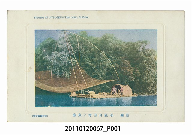 1.朝倉剝製所發行之多色印刷明信片,影像內容為日月潭畔一艘竹筏船屋,前方架著四手吊網,是日月潭當地特有的捕魚景觀。