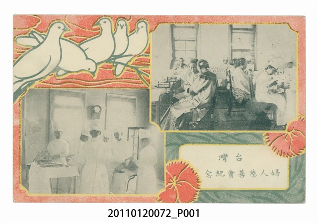 1. 本物件為以臺灣婦人慈善會為主題的明信片。正面為兩張黑白照片,右上為生產照,照片中女子分為穿著清朝服裝與白色護士袍。左方為進行手術中的照片。左上方繪有五隻白色鴿子,右下角有「台灣婦人慈善會記念」字樣。背面為書寫處,右上角為郵票黏貼處,內有「內國には壹錢五厘」、「外國には四錢切手」字樣。右側印「郵便はかき」,上方為「CARTE POSTALE」。