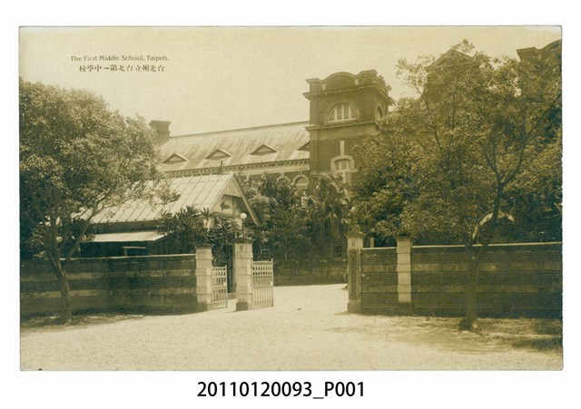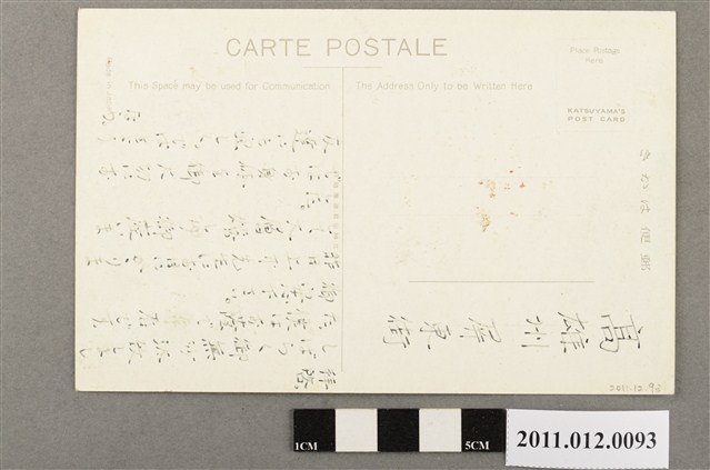 1. 本物件為以臺北第一中學校為主題的明信片。正面為臺北第一中學校校門的黑白照,校門右側掛「臺北第一中學校」招牌,門後建築為紅樓校舍。背面為書寫處,右上角為郵票黏貼處,內有「Place Postage HERE」、「KATSUYAMA'S POST CARD」。右側印「郵便はがき」,正上方印「CARTE POSTALE」、「This space may be used for Communication」、「The Address Only to be written Here」。中間為T形分隔線,右方有供書寫對齊的虛線。左側印「Made in Japan」。有書寫痕跡,寫有「高雄州屏東街」及通訊內容。2. 臺北第一中學校為日治時期由臺灣總督府建立的中學,於西元1922年更名為臺北州立臺北第一中學校。為今臺北市立建國中學。紅樓校舍為臺灣總督府土木局營繕課之近藤十郎設計,現為市定古蹟。