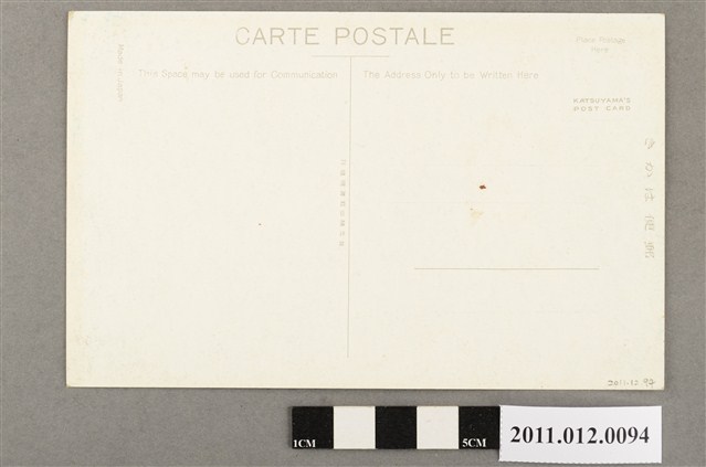 1. 本物件為以臺北第一中學校為主題的明信片。正面為臺北第一中學校校舍的黑白照片,校舍前為兩個球場,球場邊設有一小棚。右上方印「The first Middle School, Taipeh. 台北州立台北第一中學校(校舍の一部)」。背面為書寫處,右上角為郵票黏貼處,內有「Place Postage HERE」、「KATSUYAMA'S POST CARD」。右側印「郵便はがき」,正上方印「CARTE POSTALE」、「This space may be used for Communication」、「The Address Only to be written Here」。中間為T形分隔線,中間印有「台北勝山寫真館發行」,右方有供書寫對齊的虛線。左側印「Made in Japan」。