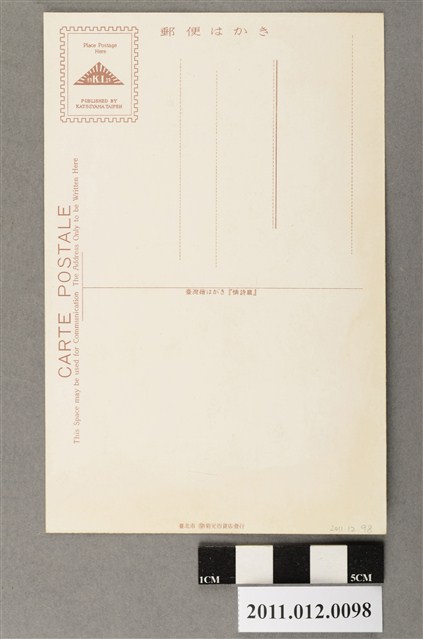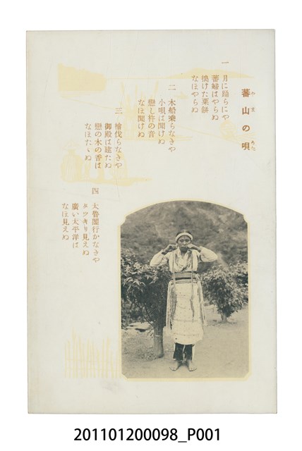 本物件為以臺灣日語歌曲為主題的明信片。正面為「蕃山之唄」的歌詞,右下方有一吹奏口簧琴的原住民女子黑白照片。歌詞分為四段,(一)月に踊らにや,蕃婦はやらぬ,搗けた粟餅,なほやらぬ;(原住民女子不在月亮上跳舞,搗著小米完成粟餅)(二)木船乘らなきや,小唄は聞けぬ,戀し杵の音,なほ聞けぬ;(我沒有乘船,沒有聽曲,我也聽不到愛戀的杵音)(三)檜伐らなきや,御殿は建らぬ,戀の木のは,なほたしぬ;(沒有砍伐檜木建造宮殿,也沒有愛戀之木)(四)太魯閣行かなきや,タツキリ見えぬ,廣い太平洋は,なほ見えぬ(前往太魯閣,看不見立霧,廣闊的太平洋,也看不見了)。背面為書寫處,右上方為郵票黏貼處,內有「Place Postage Here」、「PUBLISHED BY KATSUYAMA TAIPEH」字樣,中間有一三角形,內印「K.I.」、「特許」字樣。右側印「郵便はがき」,上方印「CARTE POSTALE」、「This Space may be used for Communication」、「The Address Only to be Witten Here」,下方為一T形分隔線,中間左側印「臺灣繪はかき『情詩篇』」,右側印有供書寫對齊的虛線。左側印「臺北市(榮)菊元百貨店發行」。