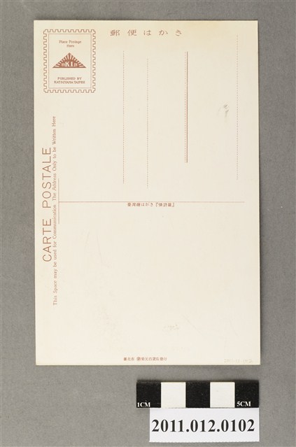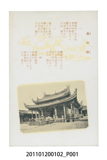 本物件為以臺灣日語歌詞為主題的明信片。正面為「島の唄」的歌詞,下方為一廟形建築的黑白照片。歌詞分為四段,(一)野良のこみちを,水牛の脊で,さまが來るぞへ,歌で來る,大屯かすみが,ほれ春だ;(野良的小巷裡,喜歡騎在水牛的背上唱著歌,這是春天。)(二)椰子の並樹が,たそがれて,𦛳も真赤に,タ燒ける,七夕星が,ほれ夏だ;(椰子樹在暮光之下是紅色的,我的胸口也是,夕陽燃燒著,天邊明亮的星星。這是夏天。)(三)媽祖のほこらに,香焚いて,さまを占なや,何と出る,筶がつめたい,ほれ秋だ;(媽祖廟裡,焚燒著香煙,筶能夠占出阻礙與回應,這是秋天。)(四)蕃山の娘の,杵歌が,すゝり泣くよで,しよんがいな,新高次高,ほれ冬だ(新高山蕃山的少女的杵歌如泣如訴,這是冬天)。背面為書寫處,右上方為郵票黏貼處,內有「Place Postage Here」、「PUBLISHED BY KATSUYAMA TAIPEH」字樣,中間有一三角形,內印「K.I.」、「特許」字樣。右側印「郵便はがき」,上方印「CARTE POSTALE」、「This Space may be used for Communication」、「The Address Only to be Witten Here」,下方為一T形分隔線,中間左側印「臺灣繪はかき『情詩篇』」,右側印有供書寫對齊的虛線。左側印「臺北市(榮)菊元百貨店發行」。