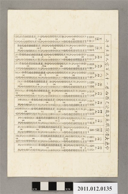 本物件為宣統元年PEACOCK牌香菸廣告年曆,正面右上角有三包香菸圖示,左下角有一包,中央寫著「刻木事親」以及其圖示。背面有宣統元年之年曆,因而可判斷時間為西元1909年前後。