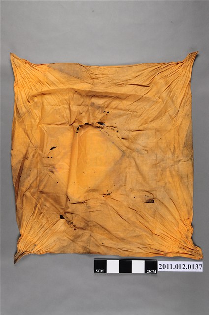 本物件為蔡和順行包裝布巾,中央有「蔡」字商標,下方寫著和順行,包裝布髒污程度甚高,或可推測其原包裝物品為易沾染性質的商品,無法推定其準確年代及用途。