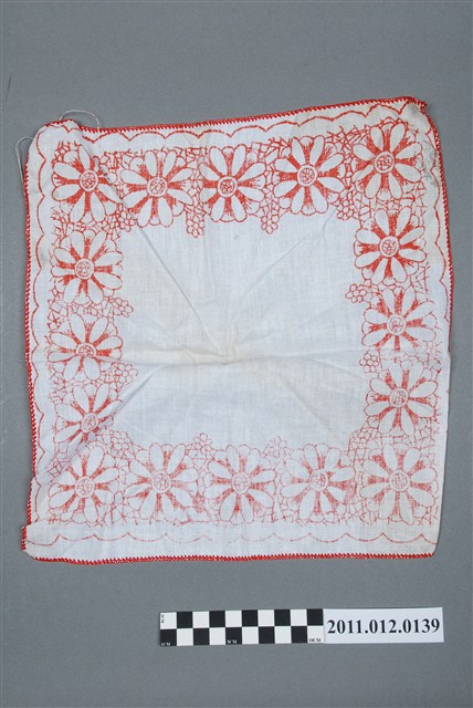 本物件為一條手帕,以白色為基底,四周以紅色花朵裝飾圍起,每朵花皆為8片花瓣;除此之外一片純白,無明顯使用痕跡,亦無法多作其餘年代或製造者的判斷。