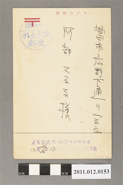 1.本物件為日本資生堂化妝品紀念品明信片,採直式印刷。一面以化妝女子半身照為底圖,底圖上覆印昭和37年度花樁會紀念品贈送的相關訊息。一面為明信片,左上有紅色印刷的日本郵便局「〒」的符號,符號上覆蓋藍色圓形酒田市郵便局「料金別納」(費用另付)的郵戳;上端中央以紅色字體由左而右印上「郵便はがき」字樣,即日文明信片之意;中央即右側有以黑筆直式書寫之收件人姓名及住址;最下方有以人工蓋上的資生堂美容諮詢須知及日期章。2.資生堂前身是1872年在日本東京銀座創立的資生堂藥房,1927年改組為股份有限公司。戰後1957年,資生堂公司在臺灣成立分部,是公司在海外設立的第一家分公司。