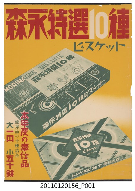本件森永企業製特選10種薄餅乾禮盒宣傳海報為紙質印刷品,呈長45.5公分,寬63公分之直式長方形,作單面彩色印刷。版面以黃橘色作為底色,中段作橫式漸層,上端以紅色印有「森永特選10種」,綠色「ビスケット」字樣,為薄餅乾之意。畫面中央處以1大1小共2盒餅乾包裝盒商品照為主視覺,左下角處則印有紅字「本年度の奉仕品」以及內含10種餅乾之說明,即為物美價廉之意,左側邊緣標示有大盒1元,小盒50錢商品價格。
