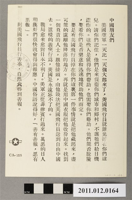 此物件為二戰末期中美合作傳單,標題為「善有善報 惡有惡報」,圖像內容是握手言歡的中國農民與美軍飛行員,圖像下方印有綜合了雙方旗幟特徵的識別標誌,以及「從這種標誌認出你們的盟友」字樣。此傳單背面印有一則書信體短文,說明此傳單的時空背景。此物件正、反面蓋有郵戳各一枚,戳記時間為1946年1月10日。 中美合作之歷史可追溯至1943年的《中美合作所協定》,基於1941年珍珠港事件的歷史教訓,介入太平洋戰局的美國向中華民國謀求情資援助。進而,中美雙方以重慶為核心設立了共同的特工機構,針對日本在太平洋的軍事活動進行偵防與干擾,這同時也加強了國民黨在內戰中的剿共力量。《中美合作所協定》結束於1946年。 後在1949年中國共產黨迅速吞併整個中國,以國民黨政府被迫僻處一隅,遷往臺灣固守,美國杜魯門總統於是於1950年1月發表「袖手旁觀(hand-off)聲明」,表示對臺灣的放棄立場。然而自1948年捷克共產黨的政變、1949年蘇聯的核子彈試爆成功、中國的共產化以及「麥卡錫主義」的推波助瀾,導致美國國內的反共情緒高漲,而在「韓戰」爆發後,決定遏止共產黨擴張的美國作出更直接的手段,即派出第七艦隊巡防臺灣,並提供國民黨政府經濟、軍事上的援助。