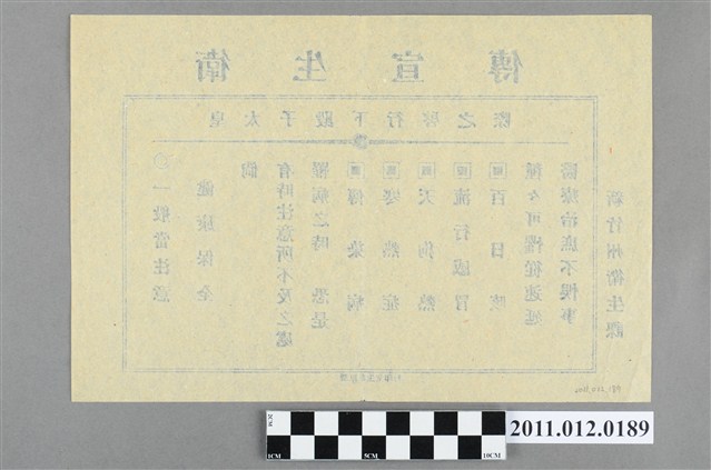 1.本物件為新竹州衛生課衛生宣傳單,以白色橫向印刷藍色字樣,宣傳「一般當注意健康保全」、「有時注意所不及之處罹病之時恐是傳染病 寒熱症 天狗熱 流行感冒」等內容,希望民眾注意並盡早治療。