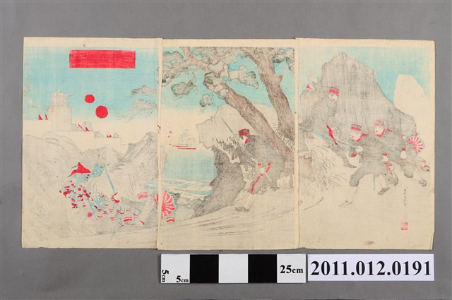 1.本件為「日軍攻擊臺灣圖」,是日本戰役浮世繪系列的作品,描繪日軍進攻臺灣的情況。2.「浮世」一詞源自佛教,泛指現世的社會百態。17世紀末被日本文人應用在美術方面,浮世繪在延寶年間(1680)廣為傳播開來。早期的浮世繪以每人為中心的風俗畫和風景畫,製作方式是先有較昂貴的肉筆畫(紙或捐本的彩繪原作),而後再出木刻版畫。隨著明治後期日本對外戰事的進行,一連串以這些戰事為對象所創作的浮世繪,開始對外流行。