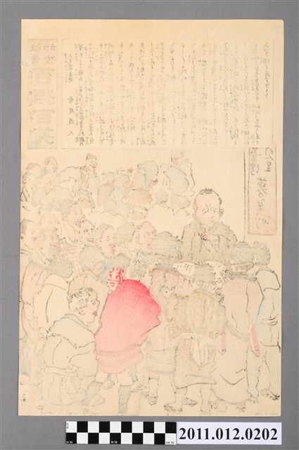 1.本件是小林清親在明治29年(1896)的版畫,以「社會幻燈百撰百笑」為名的系列創作,是浮世繪版畫的系列作品之一,以人夫募集所為題,由骨皮道人撰文,小林清親畫。2.「浮世」一詞源自佛教,泛指現世的社會百態。17世紀末被日本文人應用在美術方面,浮世繪在延寶年間(1680)廣為傳播開來。早期的浮世繪以每人為中心的風俗畫和風景畫,製作方式是先有較昂貴的肉筆畫(紙或捐本的彩繪原作),而後再出木刻版畫。小林清親(1847-1915)是日本的版畫家,他在明治9年到15年(1876-82)試著創作出「西化」的木板畫新風格,應用了西洋風景畫的技法。