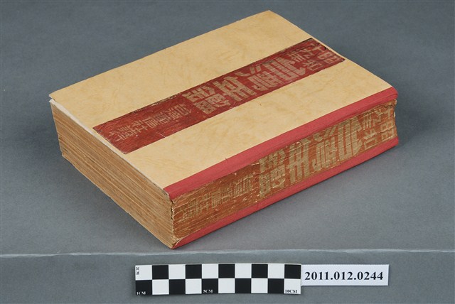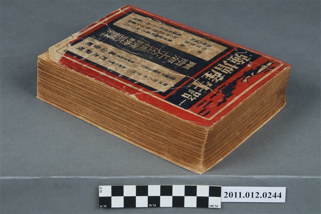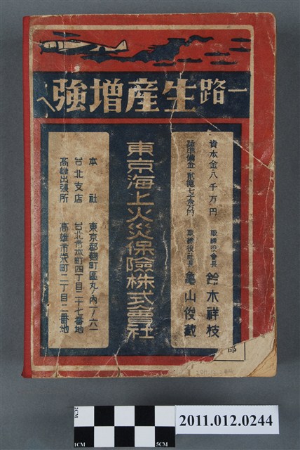 此物件為一紙質書籍,此書為1944年(昭和19年)10月25日由臺灣通信社發行的《昭和十九年臺灣年鑑》。 臺灣通信社主要報導臺灣政治、經濟、社會及一般時事,設有調查部專門處理資料,除了周刊之外,每年亦發行《臺灣年鑑》、《臺灣糖業年鑑》,此書介紹主題包含:皇室、土地、人口、國家計畫、行政、法令、財政、金融、農產、商工、水林產、運輸、通信、教育、衛生、軍事,內容包羅萬象。 日本對於臺灣的治理主要在於,將臺灣當作對外擴張理論「南進論」的重要前進基地。日本的對外侵略理論始於江戶幕府末年,當時被捕入獄的著名學者吉田松陰為因應西力東漸,提出「北割滿州之地,南收臺灣」的侵略思想以富國強兵,並影響其門下弟子高杉晉作、木戶孝允、伊藤博文、山縣有朋這些明治政府重臣。二戰前日本對歐亞大陸侵略的「北進論」與東南亞侵略的「南進論」兩者互有競爭,後在1941年4月日本與蘇聯簽訂互不侵犯條約,以及為獲得東南亞的資源,導致「南進論」成為日本的主要擴張策略(葉碧苓。2007。15-18)。