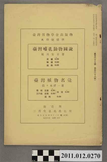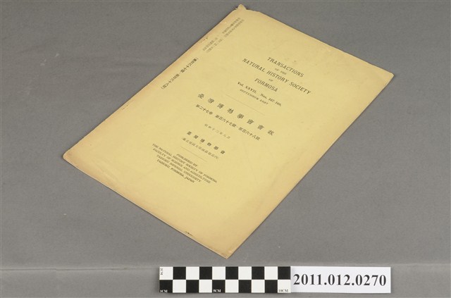 1.本件為該會報第27卷第167-168號合刊,時間在昭和12年9月,會長為素木得一,編輯兼發行人為市村毅。2.1910 年 12 月 10 日,總督府民政部殖產局附屬博物館館長川上瀧彌、中學校敎授木村德藏、國語學校助敎授相馬禎三郎及土木部技師大島正等人,於臺灣總督府殖產局附屬博物館會集會,發起、組織「臺灣博物學會」 (Natural History Society of Taiwan)。該學會制定的會則內容,重點包括:明揭以研究臺灣的動物、植物、礦物、地質學、人類學、氣象學等六種學問為目的。1911年創刊學會專屬期刊「臺灣博物學會會報(The Journal of Natural History Society of Taiwan)」,也使該會報成為上述研究的重要彙整園地。