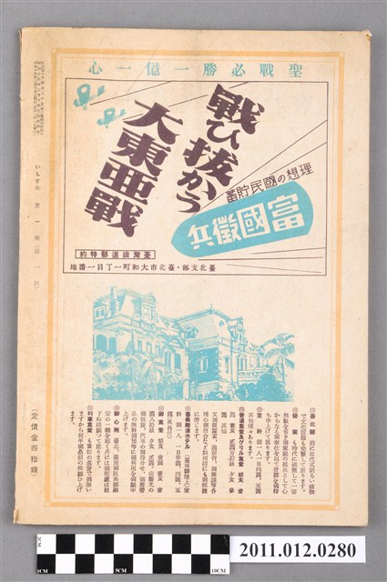 本物件為《いしずえ》創刊號,「いしずえ 」漢字為「礎」,封面繪有一火車頭及「臺灣鐵道改題」字樣,背面寫有「聖戰必勝」、「一億一心」、「富國徵兵」等標語,由臺灣鐵道協會於昭和19年(1944)2月18日發行,內容包含創刊辭、空襲經驗談、短歌俳句等等。
