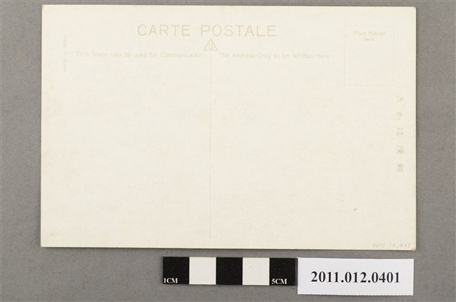 1.本物件為臺南神社的風景明信片。正面為臺南神社,從第一鳥居外略呈45度角往內拍攝;近景為第一鳥居,鳥居前左側有1個石獅,最右側立有「官幣中社臺南神社」的石柱;穿過第一鳥居為參拜道,兩側石燈籠林立。參拜道往遠處延伸可見第二鳥居;第二鳥居後方為拜殿和神殿。照片右下角第一排印有「VIEW OF PICTURESQUE SPOT TAINAN.」之英文標題,第二排由右而左印「臺南神社 (臺南市)」之標題,標題下為日文說明。明信片背面中央為1條直虛線,虛線上端有1正三角形框,框內印有「S」,「S」字樣上方橫寫「CARTE POSTALE」,為明信片之法文;豎線上端左側橫寫「This Space may be used for Communication」英文,意指這空間用以通信;豎線上端右側橫寫「The Address Only to be Written Here」,意指地址只能寫在這裡;明信片左上角以呈90度之英文直寫「Made in Japan」,以示印製地點;明信片右上角繪有虛線正長方形框,框內上半部以兩排英文書寫「Place Postage Here」,意指郵資貼在這裡;明信片最右側以呈90度由右而左書寫「郵便はがき」,為日文明信片之意。2.神社於臺灣的興建,與殖民政府想透徹進行皇民化運動有關。臺灣第一座神社為西元1897年建的開山神社,其目的為藉由鄭成功其母為日本人,作為統治臺灣的合理根據,而臺灣地區神社暴增於1936至1940年間,即是配合皇民化運動之進行。臺南神社曾為北白川宮能久親王臺南御遺跡所,即1895年親王南下平定亂事時於臺南居住之所,本為當地豪族吳汝祥宅邸,親王過世後,將其使用過之房間、器物進行保存,1901年竣工。後於1920年起建神社,社殿以阿里山之檜木建造,主要祭祀北白川宮能久親王,1923年竣工,1925年被列為官幣中社,現已拆除,原址現為臺南市美術館二館。