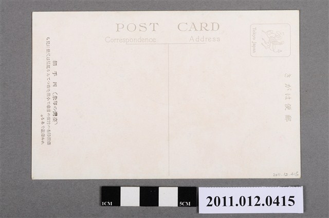 2.正面滿版印刷,無文字。背面則印有灰色文字「郵便はがき、POST CARD、Correspondence、Address」,郵票黏貼方框內有飛馬商標圖案與「Tokyo Japan」字,以及說明文字「(臺灣の印象)四手網、臺灣特有の竹皮の日傘で小魚を取つてゐる風情は又他に見られぬ奇觀である」。