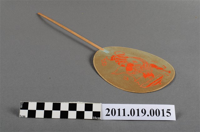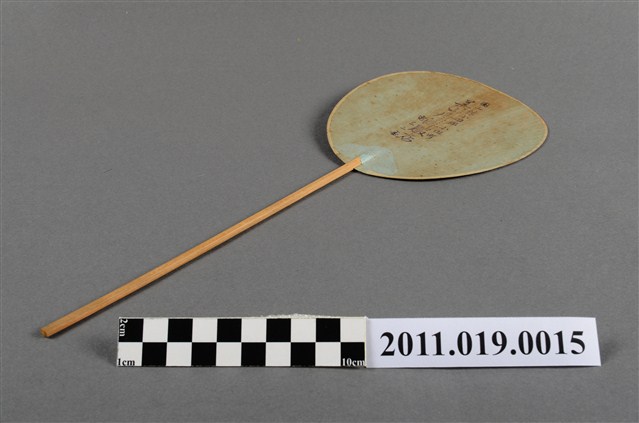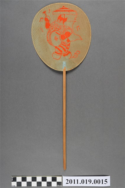 1.本件採用橢圓形扇框、雙扇面,淺棕色扇柄為扁長方型。紋樣方面,一面為橘色單色印刷的敲擊樂器的擬人動物,另一面印有「關山縣小田郡小田町 美山屋洋服店 電三二番」字樣。扇面無論正反面均有泛黃痕跡。2.日治時期臺灣就開始使用扇子作為廣告宣傳品,在氣候炎熱且電扇、冷氣尚未普及的臺灣,扇子是實用性很高的廣告宣傳品。此件團扇廣告內容為日本關山縣小田郡小田町美山屋洋服店,應為日本製作後流傳至臺灣。