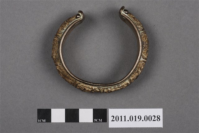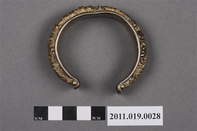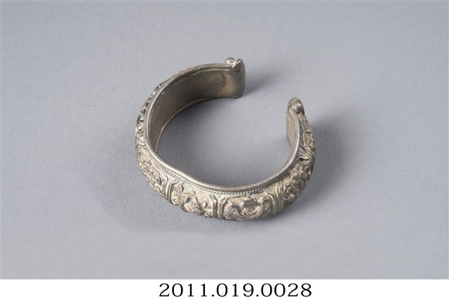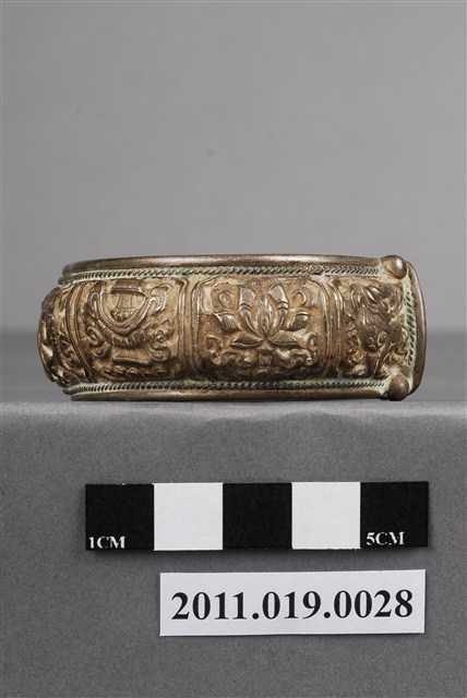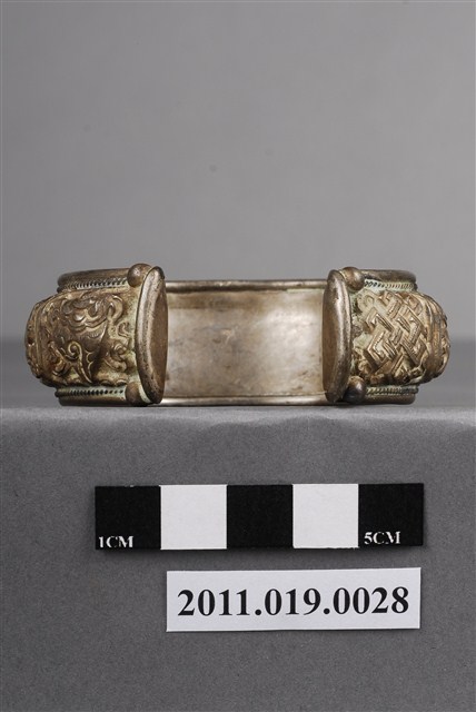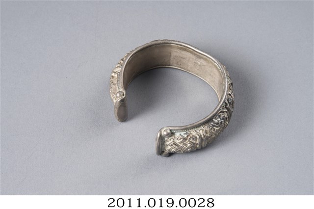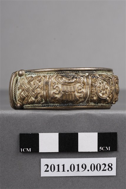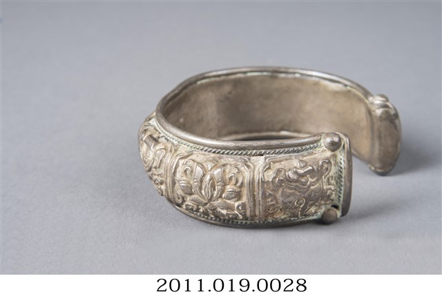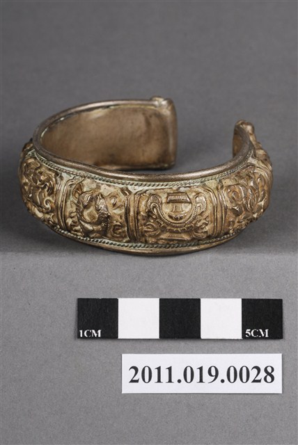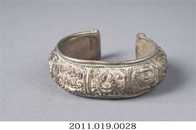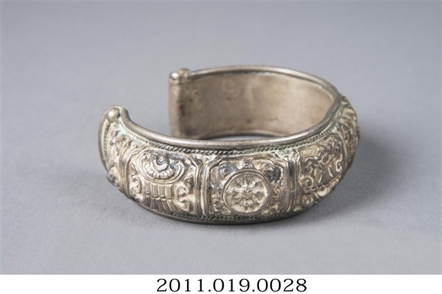 此銀手鐲造型飽滿莊重,鐲之正面圖紋凸起,依序雕有盤長、寶傘、法輪、白蓋、雙魚、寶瓶、蓮花、法螺等佛家八種吉祥紋樣,分別意味著長命百歲、護佑平安、生命不息、脫離苦厄、佛光普照、福慧圓滿、高潔純淨和佛音吉祥。此八種圖樣間以兩道凸紋,上下環飾以繩紋,鐲邊鑲以細銀條為框,使其中央八吉祥更加突出明朗。鐲之內側平滑光整,鐲端開口處向外微微翹起呈圓弧狀,上下兩端各飾有兩圓珠。全器紋飾精美細緻,弧度均勻優雅,特別顯得有立體感。