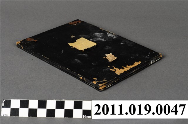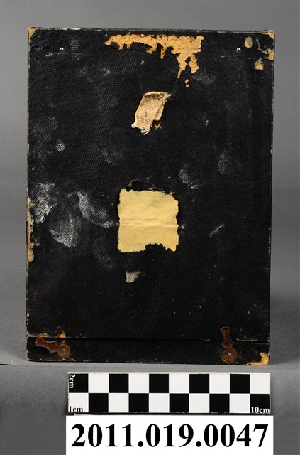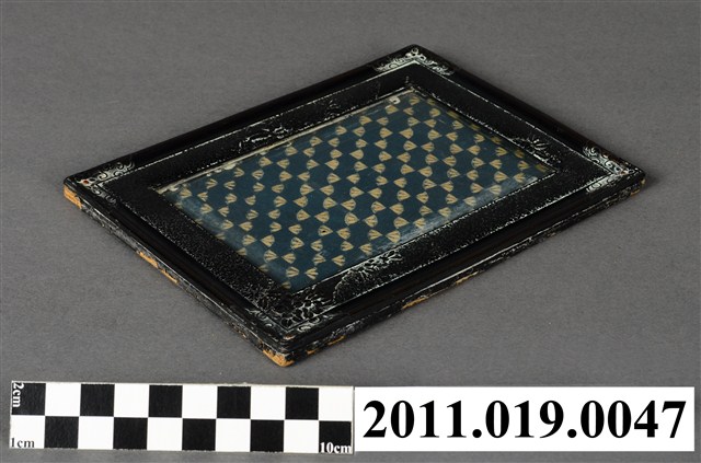 本件櫻花邊飾黑漆木相框呈直式長方形,四邊條框為木材製作,端角處以L形金屬片作裝飾,金屬片轉角處雕刻花朵,並以紅色圓石鑲嵌,於兩側向外延伸捲曲藤蔓。內框則以金屬片淺浮雕雕刻有櫻花與櫻花樹幹作裝飾,表面覆蓋黑色漆料後,另以拋光的方式凸顯輪廓。中心處則鑲嵌有透明玻璃片。相框底板為紙質厚紙板,背面另以黑色皮紙包覆,內側則襯黏方格紋底紙,其方格作對稱角半圓白色印花圖樣。相片框背板以上掀式開闔更換照片,下方底緣左右兩側另外釘固有葫蘆形金屬片,作底板開闔口固定之用。本件相框背面上端帶有蟑螂與蛀蟲啃食過後的痕跡,中央處則