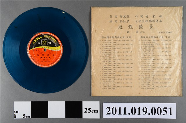1.本物件為高雄民謠專輯,塑膠材質。該唱片物件包括封套及唱片。封套可見「高雄民謠」、「麗美唱」、「作曲 郭萬枝」、「伴奏 自由中國第一流:天使唱片專屬樂隊」、「風靡全台牛馬調」、「天使唱片廠發行」字樣。該唱片中央可見「ANGEL RECORD」、「天使」、「高雄民謠」、「版權所有 請勿翻印」、「Hi Fi立体聲 NL 3 B」、「塩埕區長」、「郭萬枝調」、「下篇」、「53.2.25」字樣。