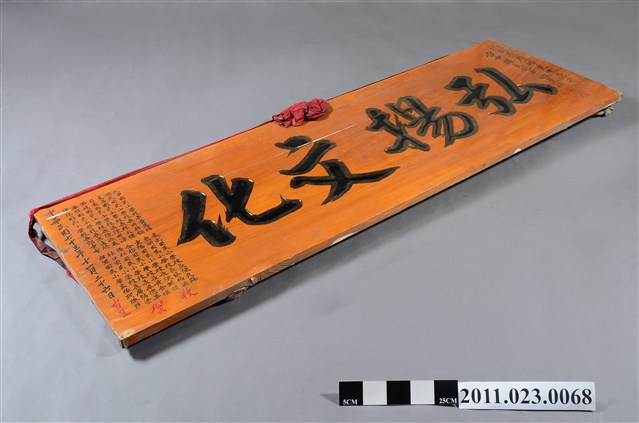 捐贈者於民國73年11月由臺中縣教育局體健課課長升任臺中縣文化中心主任時,由大甲國小校長黃萬福、文武國小校長陳天賜等14所國小校長及主任同賀,致贈「弘揚文化」匾額。此匾見證了文教開始分家,文化從教育系統獨立出來,全國文化中心剛成立初期,文化人員大部分是由教育人員轉任的歷史軌跡。
