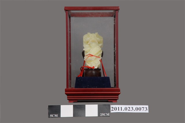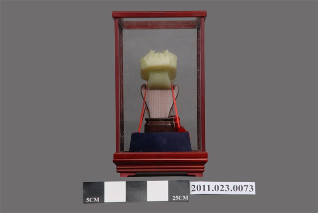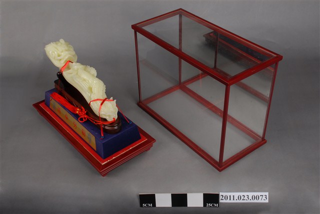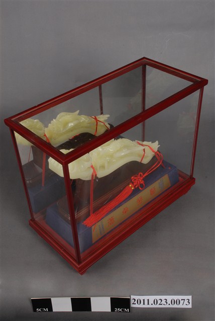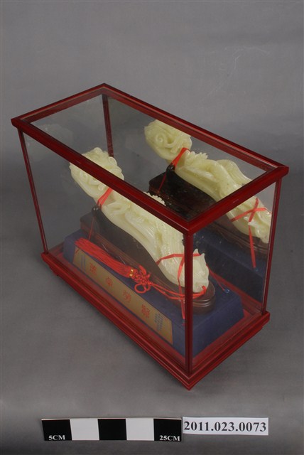 捐贈者於民國86年12月由臺中縣政府教育局局長升任高雄市立歷史博物館時,由臺中縣霧峰國小校長陳美繁致贈祝賀。外罩有玻璃框盒,正面後為鏡子。如意是玉石雕刻中常見的圖案,喻意佩帶者事事如意,心想事成。