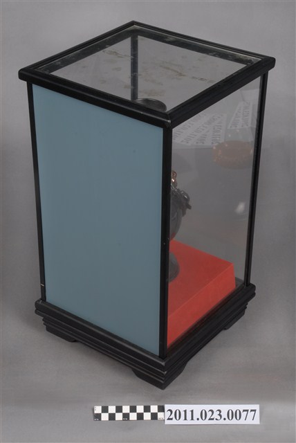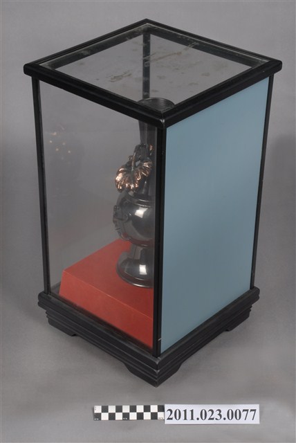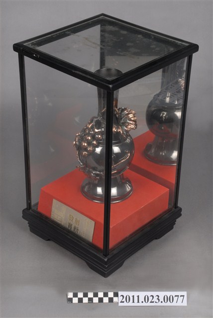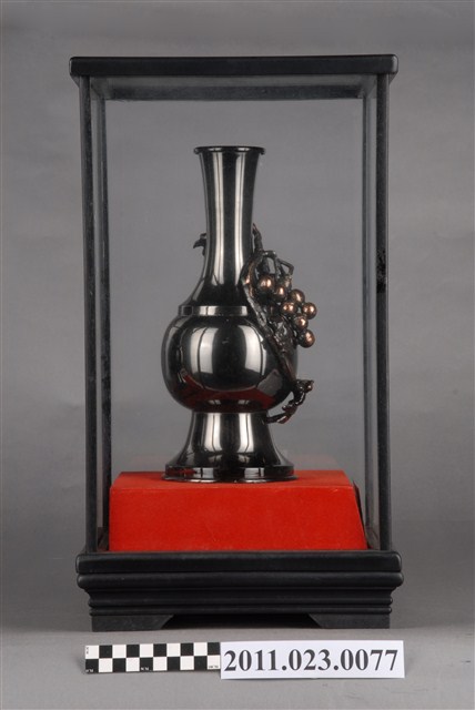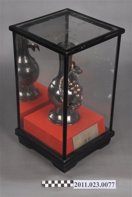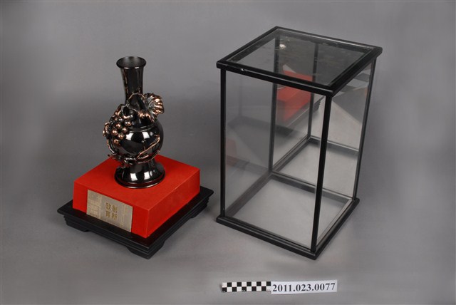 由臺灣省教育廳地方教育行政研究班輔導員許志銘、學員劉寶銀等16人致贈祝賀捐贈者升任臺中縣教育局局長。外罩有玻璃框盒,正面後為鏡子。造型上以葡萄攀爬於花瓶上,意喻豐收、平安。