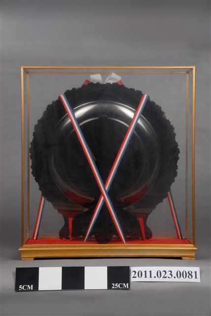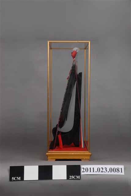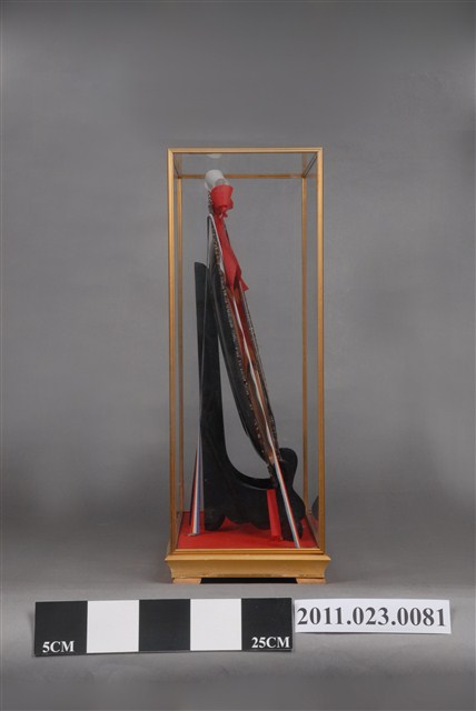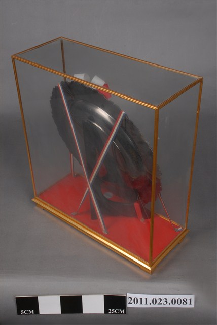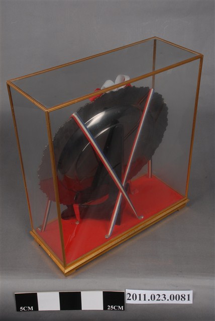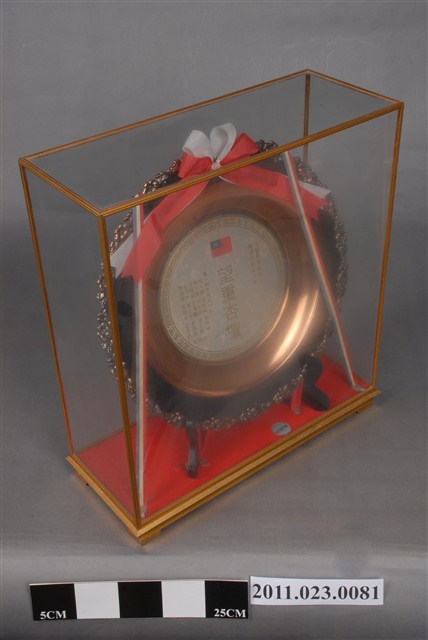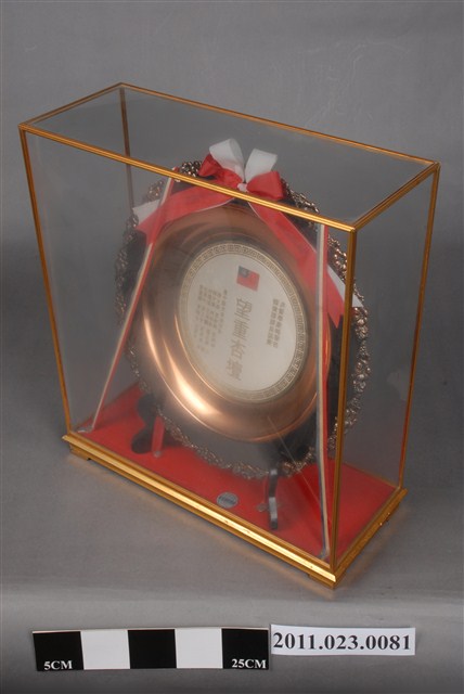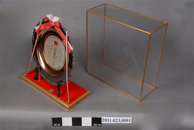 由臺中縣常青排球隊陳永義等14人致贈祝賀捐贈者由臺中縣督學升任體健課課長。推測為73年左右。外罩有玻璃框盒。