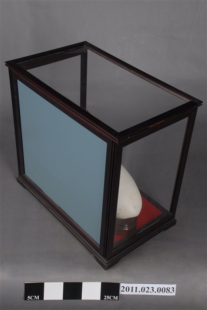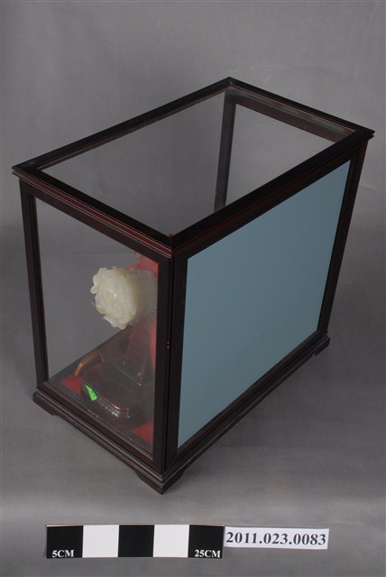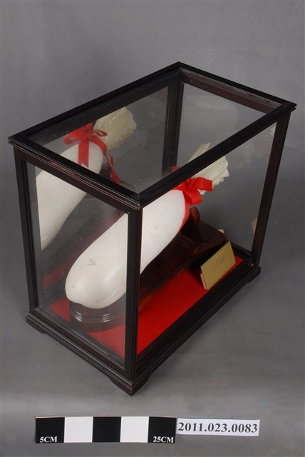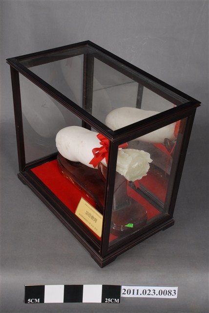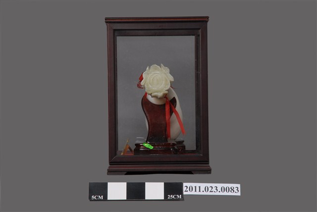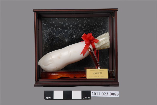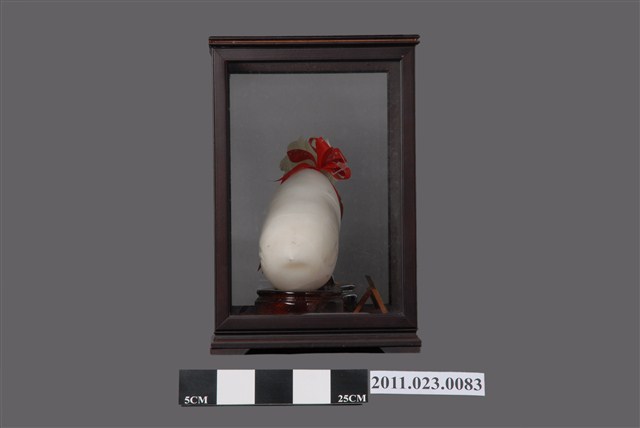 據捐贈者表示本件係民國86年1月參加國民黨第13屆臺中縣縣長黨內提名登記時,於1月29日由臺中縣15個鄉鎮市圖書館館長聯合致贈的「好采頭」,為捐贈者加油打氣。捐贈者亦於此日打出第一波文宣:「提拔洪慶峰,再創新高峰」。外罩有玻璃框盒,但缺正面玻璃。大蘿蔔,閩南語稱之為「菜頭」,取其音,祝福有個「好采頭」,是政治界最受歡迎、最常見的祝賀之禮,為本館較少蒐藏與當代選舉相關之物件。