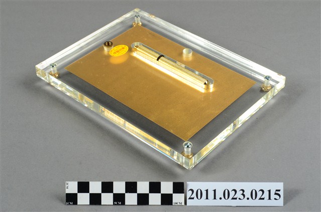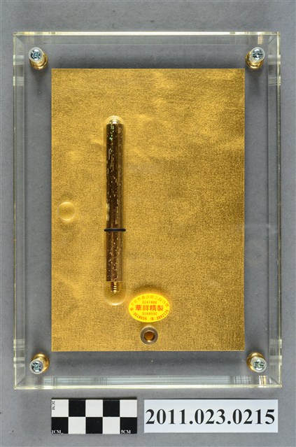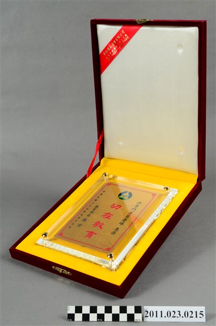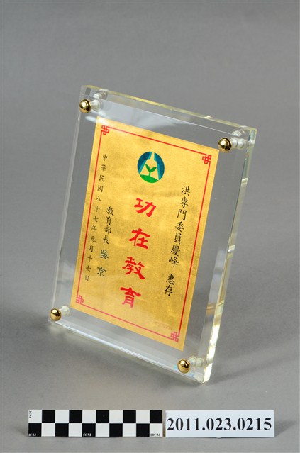 教育部長吳京致贈洪慶峰專門委員「功在教育」紀念獎牌,中華民國87年1月17日。為純金9999之獎牌,背面貼有製造商「華祥精製」之貼紙。當時洪慶峰時任高雄市立歷史博物館籌備處主任。附有外盒1個及支架1支。 華祥精製位於臺北市長沙街二段15號。