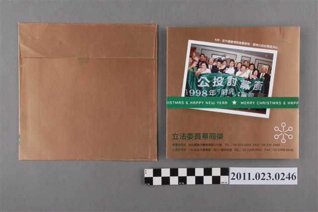 計有信封及賀年卡各1件,為立法委員蔡同榮於2006年12月25日耶誕節前夕寄與時任文建會副主委洪慶峰之賀年卡片。信封寄件人署名「立法委員蔡同榮」,留有「嘉義服務處及立委研究室」2處連絡地址與電話,下方印有「MERRY CHRISTMAS & HAPPY NEW YEAR」字樣及民主進步黨黨徽圖案。賀年卡正面為蔡同榮於2006年7月訪南非及「聖誔快樂」祝賀語。內頁印有蔡同榮於2006年推動各項政績的活動照片,例如2月率「主流聯盟」成員拜會李前總統登輝先生談內閣制。依賀卡賀詞,推測應為2006年底耶誕節前夕印製寄發。蔡同榮時任立法院第6屆委員(2005-2008)。